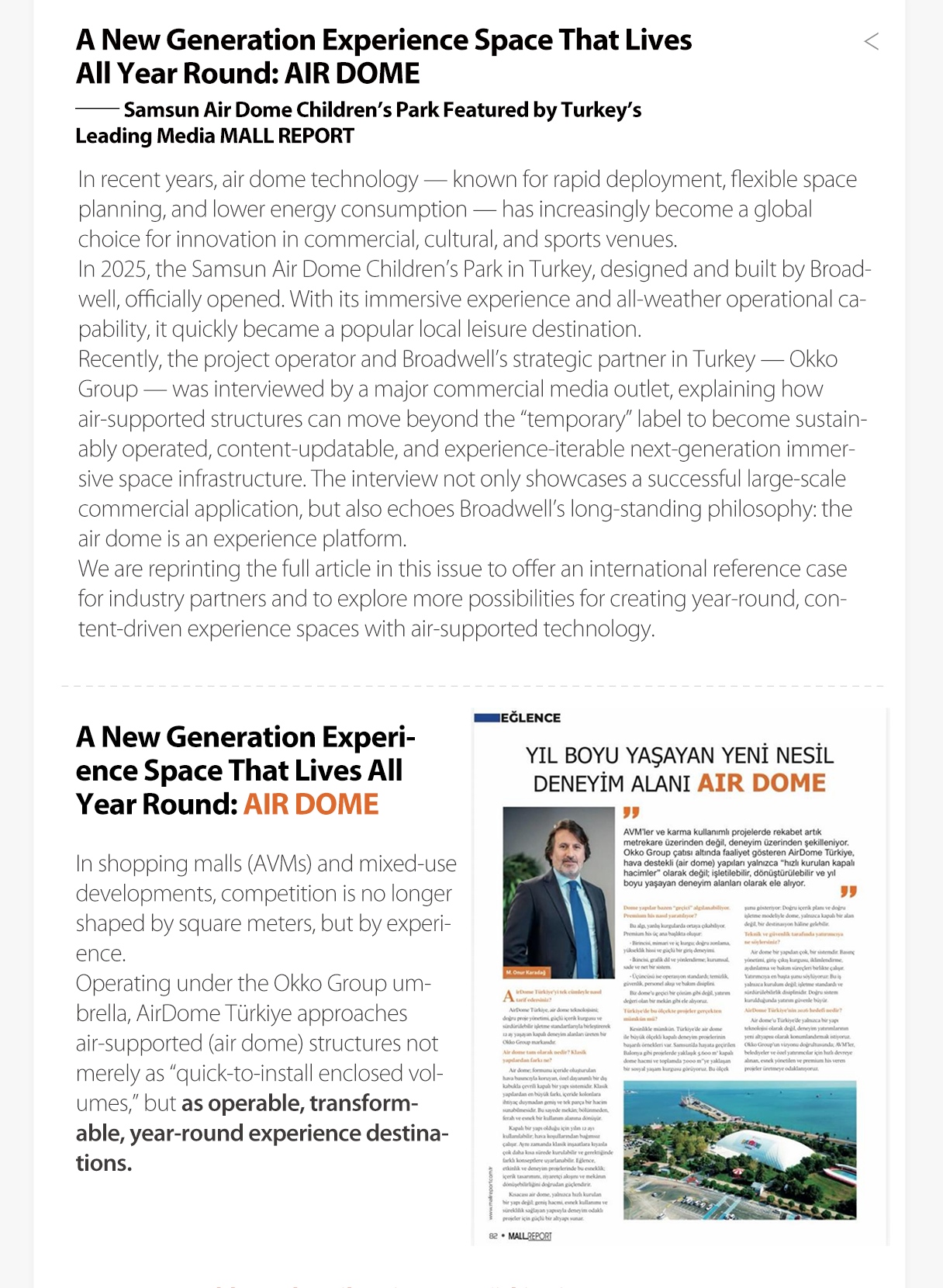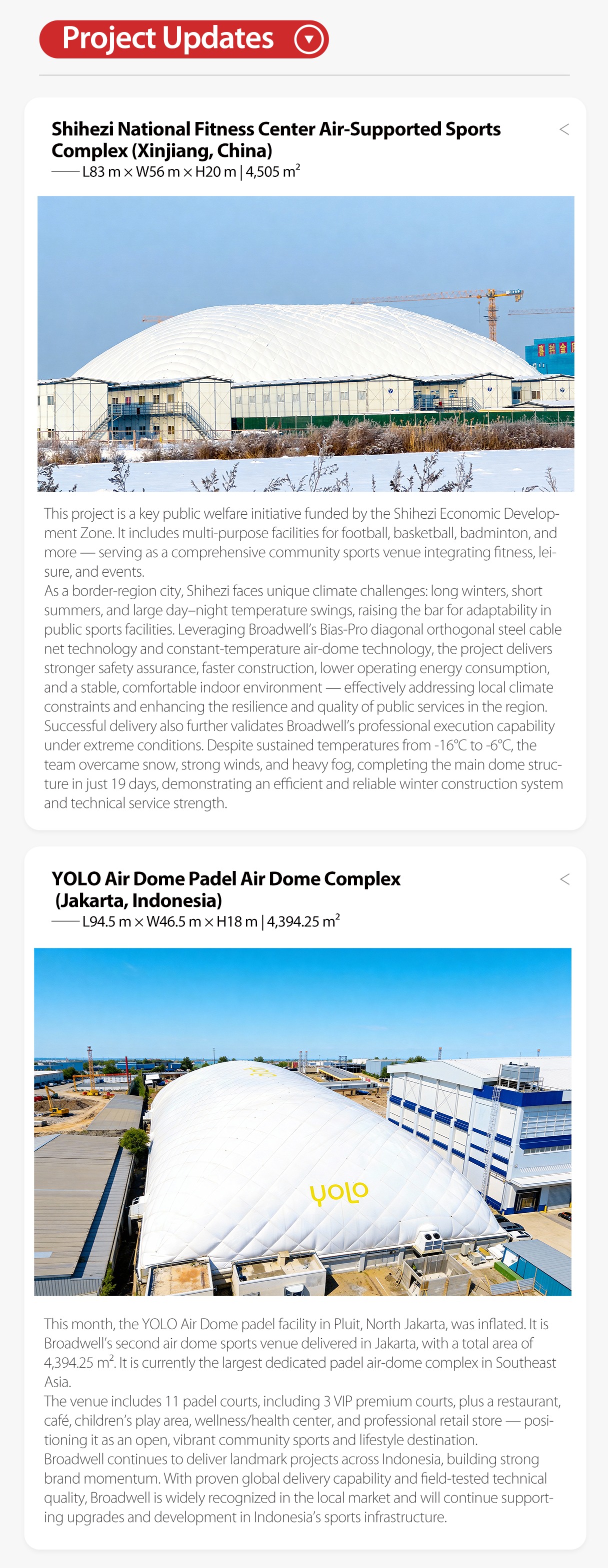 Broadwell’s latest newsletter introduces DATA DOME, an air-dome center solution designed for faster deployment, stable enclosed environmental control, and scalable expansion in response to AI-driven compute demand. The issue also covers the establishment of Broadwell Korea Co., Ltd., major events hosted at SPIKE Air Dome in Jakarta, an international case study on year-round experience spaces in Turkey, and recent project milestones in Xinjiang and Indonesia.