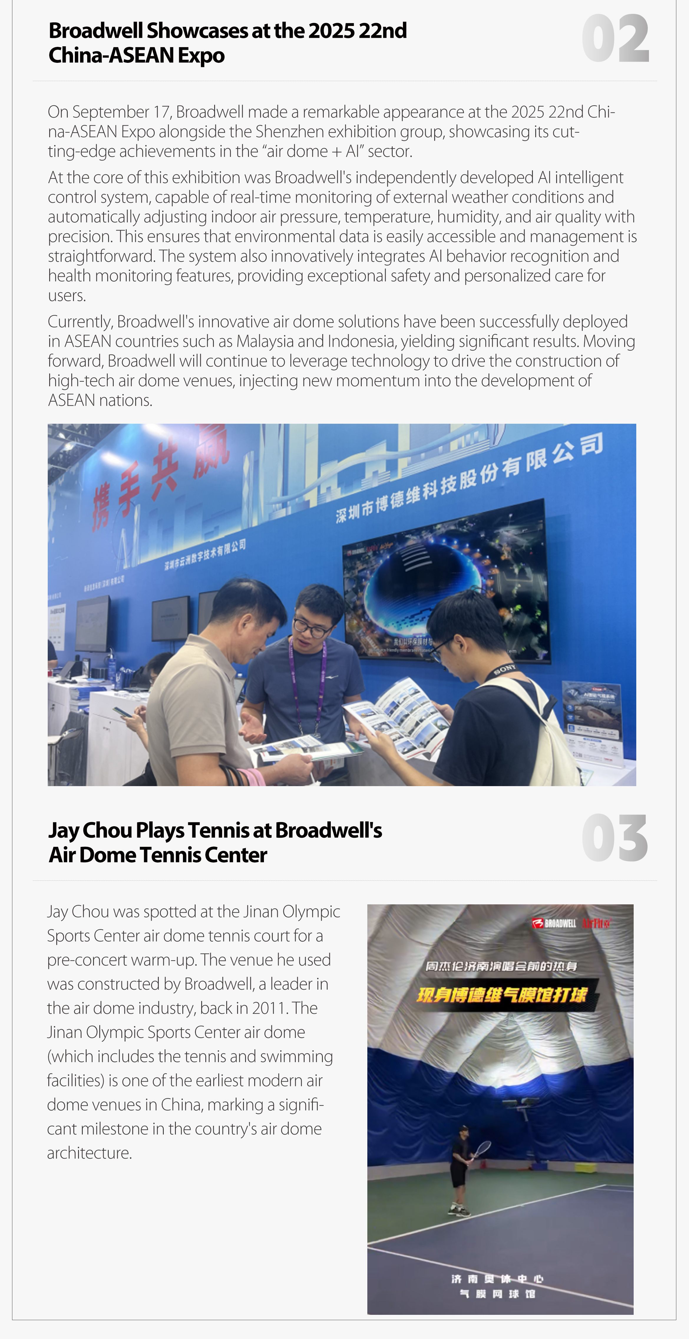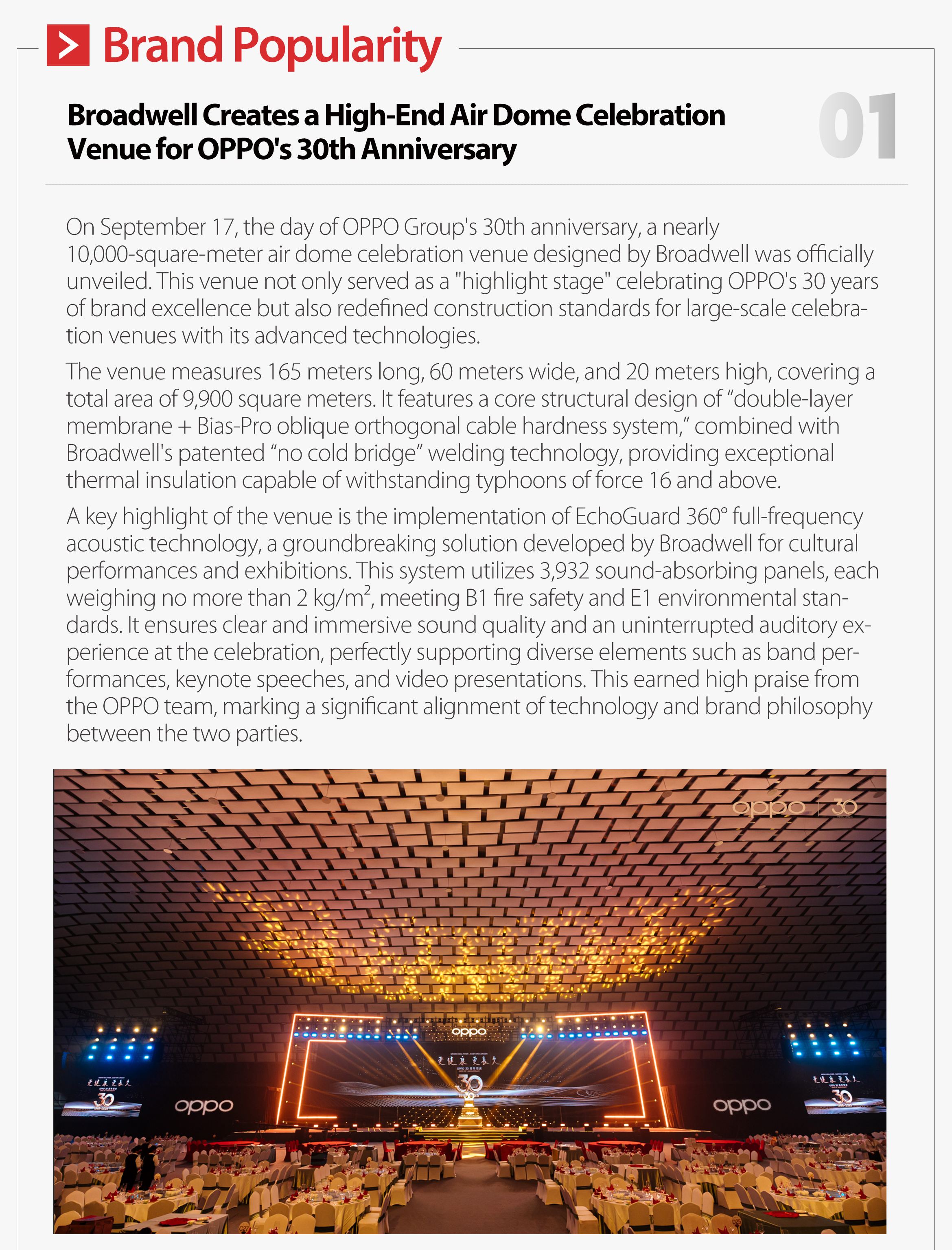 Broadwell achieved significant milestones this month, launching the world's first AirVoya™ Children's Physical Intelligence Growth Center in Turkey with over 10,000 opening-day visitors. The company constructed a 9,900-square-meter air dome venue for OPPO's 30th anniversary featuring advanced acoustic technology.