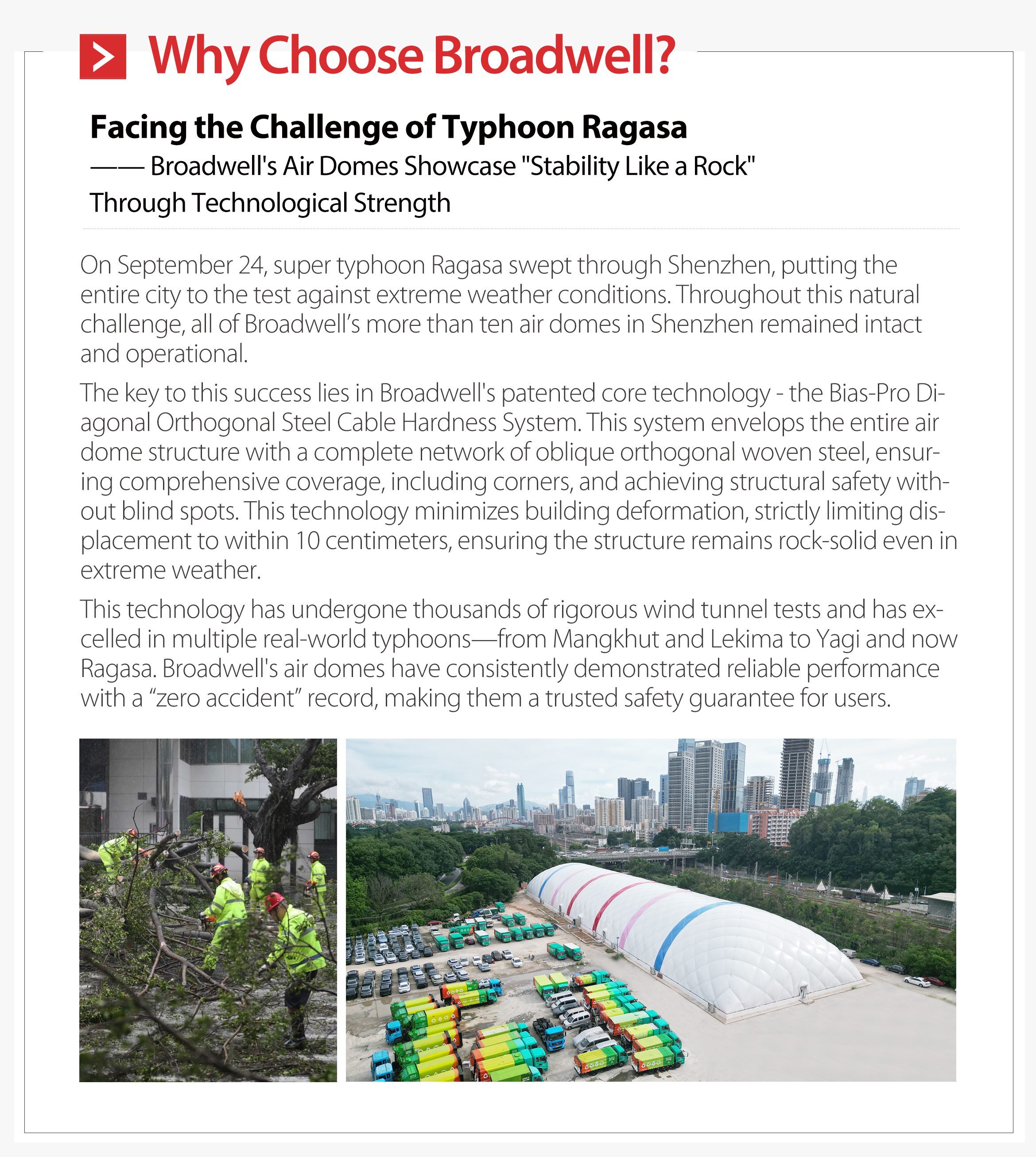 At the China-ASEAN Expo, Broadwell showcased AI intelligent control systems for real-time environmental monitoring. The company's technological strength was proven when all Shenzhen air domes successfully withstood Super Typhoon Ragasa using proprietary Bias-Pro Steel Cable Systems, maintaining a zero-accident safety record.